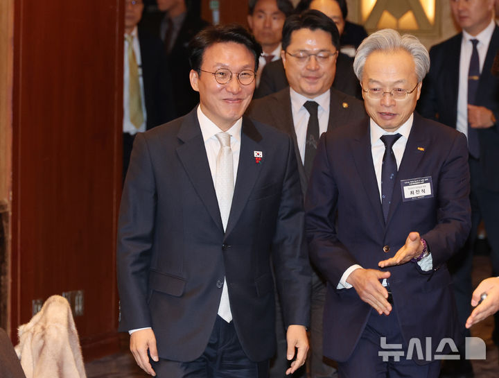 [서울=뉴시스] 김명원 기자 = 김민석 국무총리와 최진식 한국중견기업연합회(중견련) 회장이 1일 오전 서울 중구 소공동 롯데호텔에서 열린 제11회 중견기업인의 날 기념식에 참석하고 있다. 2025.12.01. [email protected]