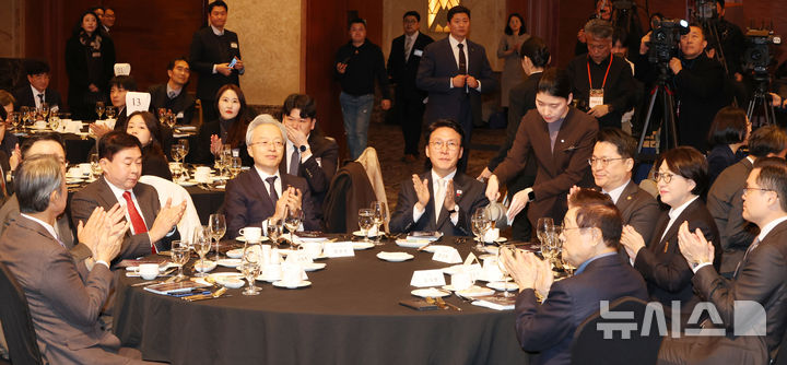[서울=뉴시스] 김명원 기자 = 김민석 국무총리와 최진식 한국중견기업연합회(중견련) 회장이 1일 오전 서울 중구 소공동 롯데호텔에서 열린 제11회 중견기업인의 날 기념식에 참석해 박수하고 있다. 2025.12.01. [email protected]