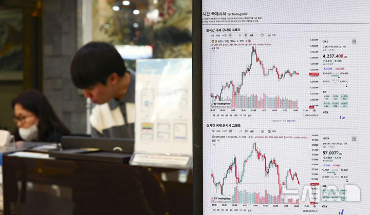 [서울=뉴시스] 김근수 기자 = 1일 오후 서울 종로구 한국금거래소 종로점에 놓인 모니터에 국제 은 시세가 실시간으로 나오고 있다.