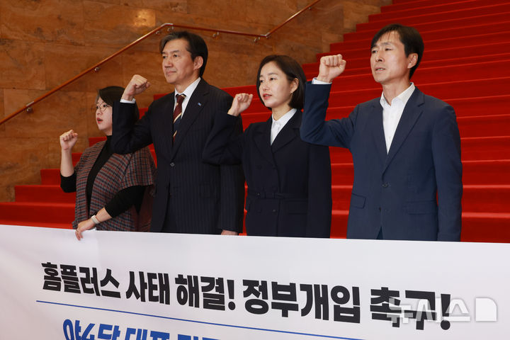 [서울=뉴시스] 고승민 기자 = 용혜인(왼쪽부터) 기본소득당 대표, 조국 조국혁신당 대표, 김재연 진보당 공동대표, 한창민 사회민주당 대표가 1일 서울 여의도 국회 로텐더홀 계단에서 홈플러스 사태 해결 및 정부 개입을 촉구하는 기자회견을 하고 있다. 2025.12.01. [email protected]