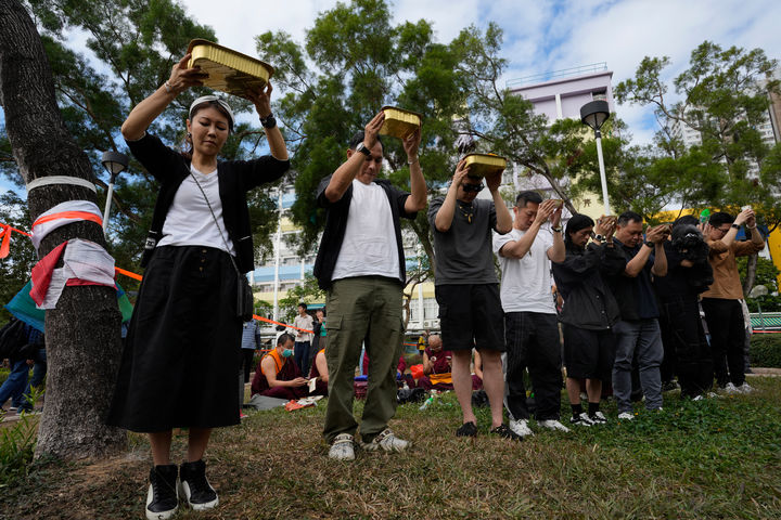 [홍콩=AP/뉴시스] 2일(현지 시간) 홍콩 북부 타이포의 '웡 푹 코트' 아파트 단지 화재 현장 인근에서 티베트식 추모 의식이 열려 추모객들이 공양하고 있다. 2025.12.02.