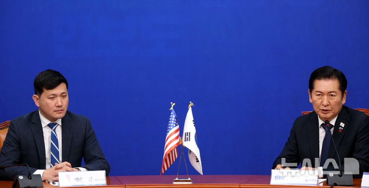 [서울=뉴시스] 조성봉 기자 = 정청래 더불어민주당 대표가 2일 오전 서울 여의도 국회에서 케빈 김 주한미국대사대리를 접견하며 인사말을 하고 있다.2025.12.02. [email protected]