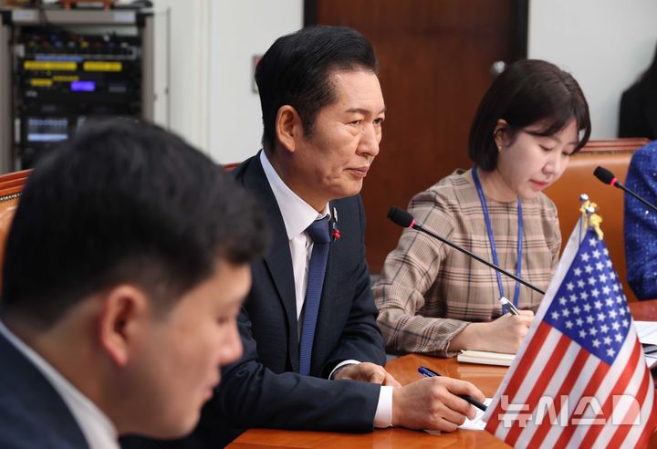 [서울=뉴시스] 조성봉 기자 = 정청래 더불어민주당 대표가 2일 오전 서울 여의도 국회에서 케빈 김 주한미국대사대리를 접견하며 인사말을 하고 있다.2025.12.02. [email protected]