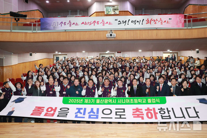 [울산=뉴시스] 배병수 기자 = 울산 시니어초등학교 제3기 졸업식이 2일 울산가족문화센터 대강당에서 열린 가운데 김두겸 시장, 박선구 시니어초등학교장,이성룡 울산시의장, 신장열 울산복지가족진흥사회서비스원장,임현철 울산시 대변인등 내빈과 졸업생들이 기념촬영을 하고 있다.(사진=울산시 제공). [email protected].