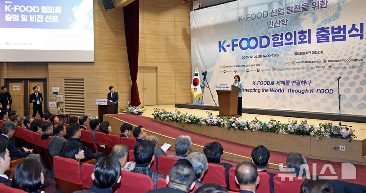 [서울=뉴시스] 김금보 기자 = 함선옥 K-FOOD 협의회 회장이 2일 서울 여의도 국회 의원회관에서 열린 K-FOOD 협의회 출범식에서 비전선포를 하고 있다. 2025.12.02. [email protected]