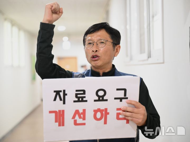 [광주=뉴시스] 이현행 기자 = 안영석 전국공무원노동조합 광주지역본부 남구지부장이 2일 오후 광주 남구의회에서 '남구의회 및 의원 규탄 조합원 결의대회'를 열고 구호를 외치고 있다. 2025.12.02. [email protected]