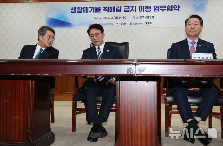 [서울=뉴시스] 김명원 기자 =김민석 국무총리가 2일 서울 종로구 정부서울청사에서 열린 생활폐기물 직매립 금지 관련 업무협약 체결식에서 김동연 경기도지사와 대화하고 있다. 오른쪽은 유정복 인천시장. 2025.12.02. [email protected]