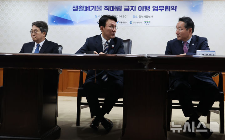 [서울=뉴시스] 김명원 기자 =김민석 국무총리가 2일 서울 종로구 정부서울청사에서 열린 생활폐기물 직매립 금지 관련 업무협약 체결식에서 유정복 인천시장과 대화하고 있다. 왼쪽은 김동연 경기도지사. 2025.12.02. [email protected]