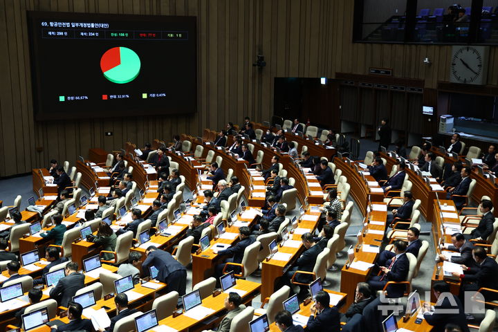 [서울=뉴시스] 김명년 기자 = 2일 오후 서울 여의도 국회에서 열린 본회의에서 항공안전법 일부개정법률안(대안)이 찬성 156인, 반대 77인, 기권 1인으로 통과되고 있다. 2025.12.02. [email protected]