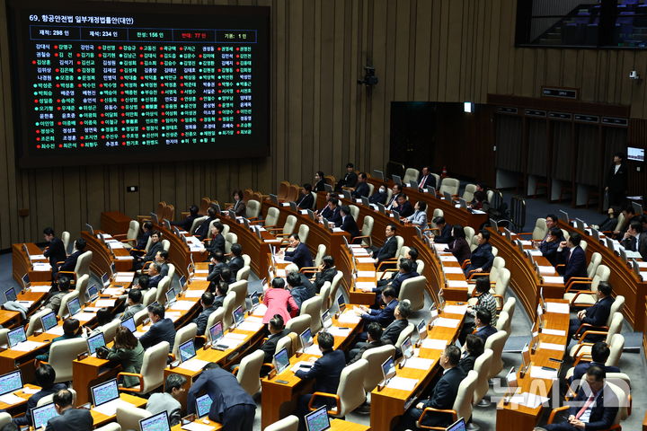 [서울=뉴시스] 김명년 기자 = 2일 오후 서울 여의도 국회에서 열린 본회의에서 항공안전법 일부개정법률안(대안)이 찬성 156인, 반대 77인, 기권 1인으로 통과되고 있다. 2025.12.02. [email protected]