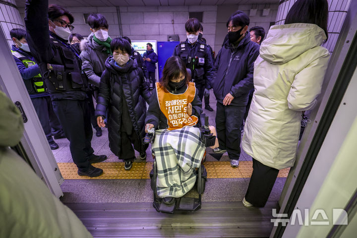 [서울=뉴시스] 정병혁 기자 = 3일 서울 중구 지하철1호선 시청역에서 열린 전장연 권리중심공공일자리 복원 쟁취 결의대회에 마친 참가자들이 지하철을 탑승하고 있다. 2025.12.03. [email protected]