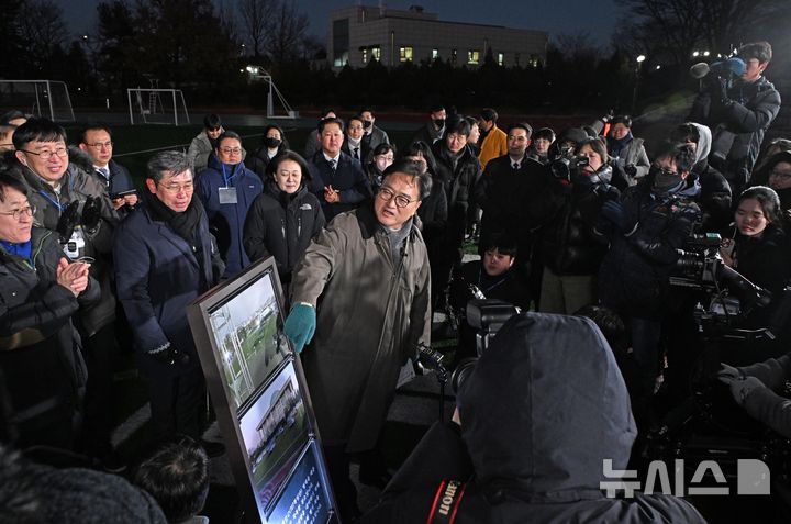 [서울=뉴시스] 국회사진기자단 = 우원식 국회의장이 12·3 비상계엄 사태 1년이 된 3일 서울 여의도 국회에서 열린 다크투어에서 도슨트로 참여해 시민들에게 계엄 당시 운동장에서의 상황을 설명하고 있다. 2025.12.03. [email protected]