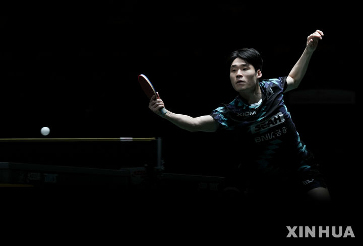 [청두=신화/뉴시스] 장우진이 3일(현지 시간) 중국 쓰촨성 청두에서 열린 2025 국제탁구연맹(ITTF) 혼성단체 월드컵 2스테이지(8강 리그) 1차전 3매치 남자 단식에서 프랑스의 알렉시스 르브렁과 경기하고 있다. 장우진은 1-2(3-11 10-12 11-9)로 패했으나 한국은 합산 점수 8-7로 프랑스에 가까스로 승리했다. 2025.12.02.