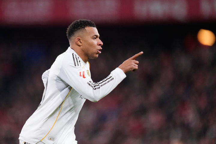 [빌바오=AP/뉴시스] 레알 마드리드의 킬리안 음바페가 3일(현지 시간) 스페인 빌바오의 산 마메스에서 열린 2025-26 라리가 15라운드 빌바오와 경기 전반 7분 선제골을 넣고 세리머니하고 있다. 음바페는 2골 1도움을 기록하며 팀의 3-0 승리를 이끌었고, 레알 마드리드는 선두 바르셀로나를 승점 1점 차로 따라붙었다. 2025.12.04.
