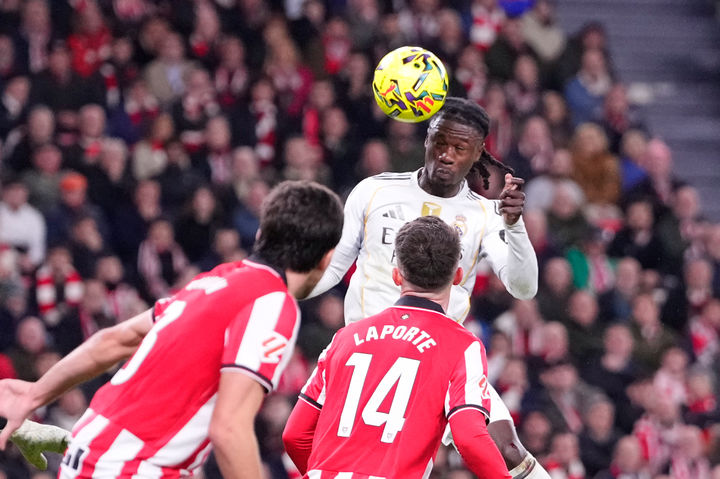 R[빌바오=AP/뉴시스] 레알 마드리드의 에두아르도 카마빙가(오른쪽)가 3일(현지 시간) 스페인 빌바오의 산 마메스에서 열린 2025-26 라리가 15라운드 빌바오와 경기 전반 42분 킬리안 음바페의 도움으로 팀 두 번째 골을 넣고 있다. 음바페는 2골 1도움을 기록하며 팀의 3-0 승리를 이끌었고, 레알 마드리드는 선두 바르셀로나를 승점 1점 차로 따라붙었다. 2025.12.04.