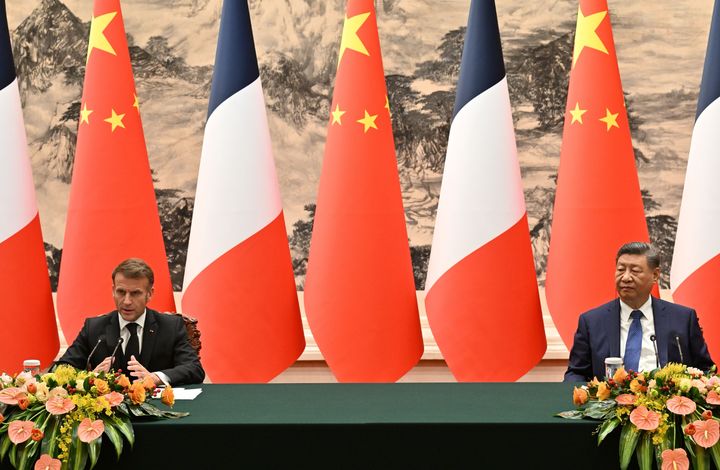 [베이징=AP/뉴시스] 중국을 국빈 방문한 에마뉘엘 마크롱(왼쪽) 프랑스 대통령이 4일(현지 시간) 중국 베이징 인민대회당에서 시진핑 중국 국가주석과 공동 기자회견하고 있다. 2025.12.04.