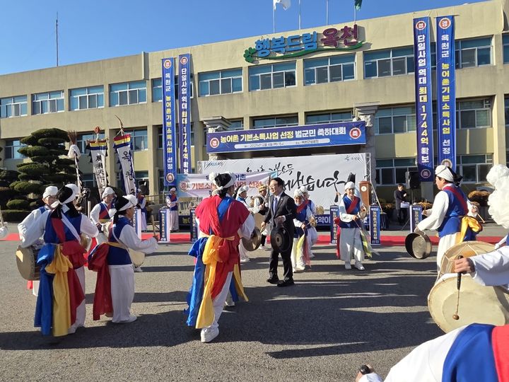 [옥천=뉴시스] 4일 오후 황규철 충북 옥천군수와 청산면 민속보존회 회원들이 옥천군청 광장에서 꽹과리를 두드리며 '농어촌 기본소득 시범사업 추가 선정 범군민 축하대회' 서막을 열고 있다. (사진=옥천군 제공) 2025.12.04. [email protected]