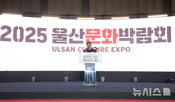[울산=뉴시스] 배병수 기자 = 김두겸 울산시장이 4일 오후 울산 울주군 울산전시컨벤션센터에서 열린 2025 울산문화박람회 개막식에서 환영사를 하고 있다[email protected].
