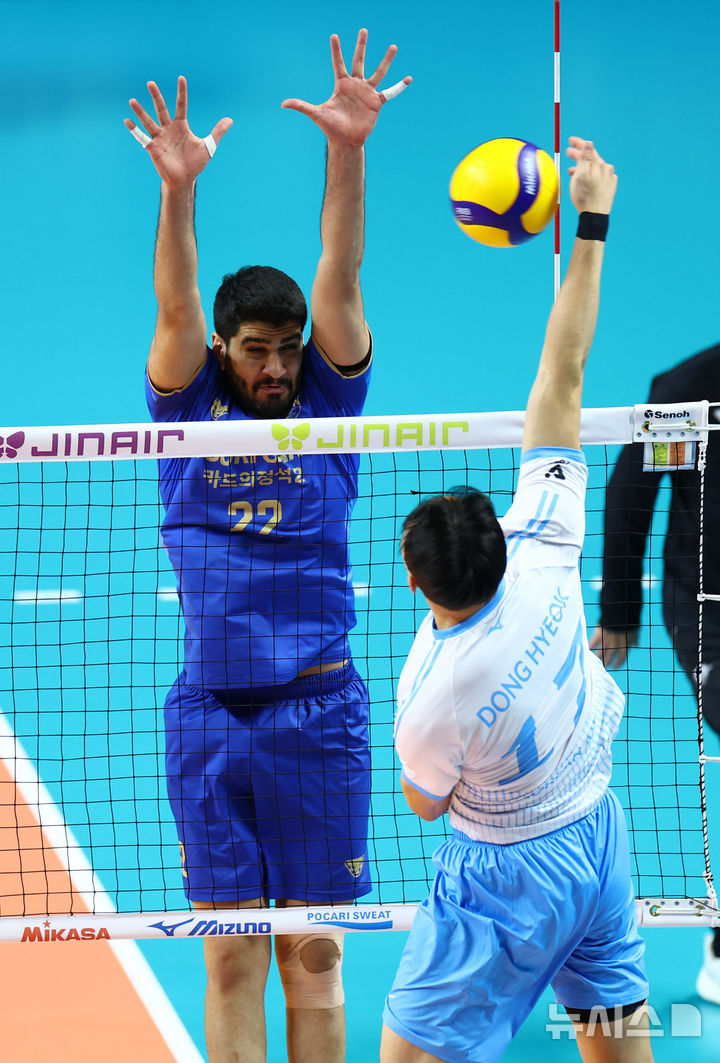 [서울=뉴시스] 황준선 기자 = 4일 서울 중구 장충체육관에서 열린 진에어 2025~2026 V-리그 남자부 대한항공 점보스와 우리카드 우리WON의 경기, 우리카드 하그파 라스트가 수비하고 있다. 2025.12.04. [email protected]