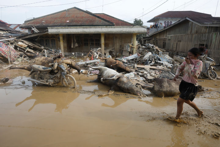 [아체 타미앙=AP/뉴시스] 4일(현지 시간) 인도네시아 수마트라섬 아체 타미앙에서 한 이재민 여성이 홍수로 죽어 나간 동물 사체들 옆을 지나며 코를 틀어막고 있다. 2025.12.05.