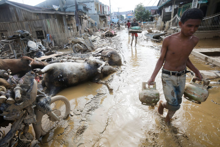 [아체 타미앙=AP/뉴시스] 4일(현지 시간) 인도네시아 수마트라섬 아체 타미앙에서 홍수 이재민들이 침수 피해 지역에서 건져낸 물품을 들고 동물 사체 옆을 지나고 있다. 2025.12.05.