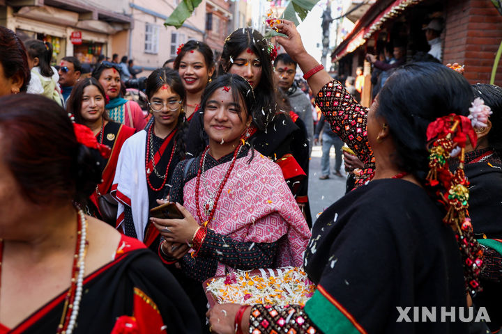 [카트만두=신화/뉴시스] 4일(현지 시간) 네팔 카트만두에서 요마리 푼히 축제가 열려 행진하는 사람들이 꽃가루 세례를 받고 있다. 네팔에서는 12월 보름이 되면 요마리 푼히 축제가 열려 쌀가루 등으로 빚은 '요마리'를 나눠 먹으며 쌀을 수확하게 해준 풍요의 여신 ‘안나푸르나’에 감사한다. ‘요마리’는 ‘떡’을, ‘푼히’는 ‘보름달’을 뜻하며 꼬리 부분을 길게 빚어 해가 길어지기를 기원하기도 한다. 2025.12.05.