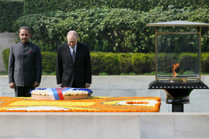 [뉴델리=AP/뉴시스] 블라디미르 푸틴 러시아 대통령이 5일(현지 시간) 인도 뉴델리의 마하트마 간디 추모 공원 라즈 가트를 방문해 헌화 후 참배하고 있다. 2025.12.05.