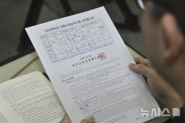 [서울=뉴시스] 홍효식 기자 = 2026학년도 대학수학능력시험 성적표 배부일인 5일 오전 서울 광진구 광남고등학교에서 '수능 만점자' 왕정건 학생이 성적표를 살펴보고 있다. (공동취재) 2025.12.05. [email protected]