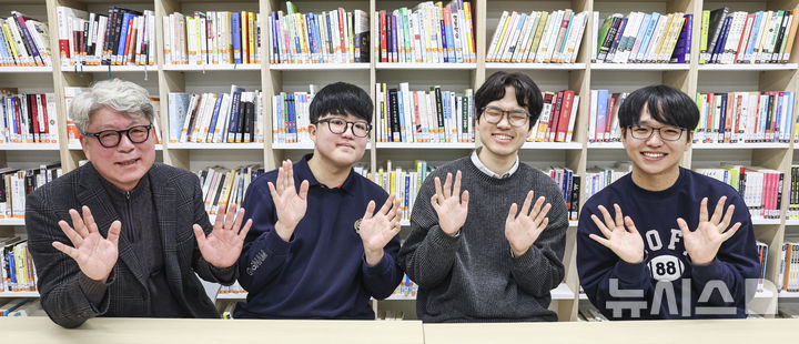 [서울=뉴시스] 홍효식 기자 = 2026학년도 대학수학능력시험 수능 만점자 왕정건 학생이 5일 오전 서울 광진구 광남고등학교에서 2026학년도 대학수학능력시험 수능 만점자 관련 언론 인터뷰를 진행하고 있다. 왼쪽부터 최재일 광남고 교장, 왕정건 학생, 고무성 광남고 담임교사, 서장협 졸업생. (공동취재) 2025.12.05. [email protected]