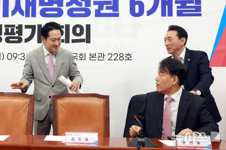 [서울=뉴시스] 고승민 기자 = 장동혁 국민의힘 대표와 윤한홍 의원이 5일 서울 여의도 국회에서 열린 이재명 정권 6개월 국정평가 회의에 참석하고 있다. 2025.12.05. [email protected]