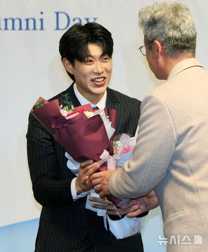 [서울=뉴시스] 홍효식 기자 = 5일 서울 강남구 호텔 리베라 청담 베르사이유 홀에서 열린 2025 한국프로야구 은퇴선수의 날에서 키움 히어로즈 송성문 선수가 최고의 선수상을 수상한 뒤 꽃다발을 받고 웃고 있다. 2025.12.05. [email protected]