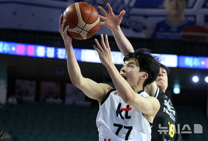 [서울=뉴시스] 이영환 기자 = 5일 오후 서울 송파구 잠실실내체육관에서 열린 2025-2026 KBL 서울 삼성과 수원 KT의 경기, 2쿼터 KT 강성욱이 슛을 하고 있다. 2025.12.05. [email protected]