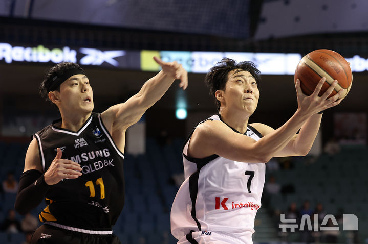 [서울=뉴시스] 이영환 기자 = 5일 오후 서울 송파구 잠실실내체육관에서 열린 2025-2026 KBL 서울 삼성과 수원 KT의 경기, 2쿼터 KT 정창영이 삼성 이관희의 수비를 피해 슛을 하고 있다. 2025.12.05. [email protected]