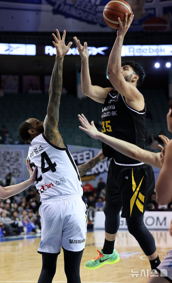 [서울=뉴시스] 이영환 기자 = 5일 오후 서울 송파구 잠실실내체육관에서 열린 2025-2026 KBL 서울 삼성과 수원 KT의 경기, 3쿼터 삼성 케렘 칸터가 KT 데릭 윌리엄스를 앞에 두고 슛을 하고 있다. 2025.12.05. [email protected]