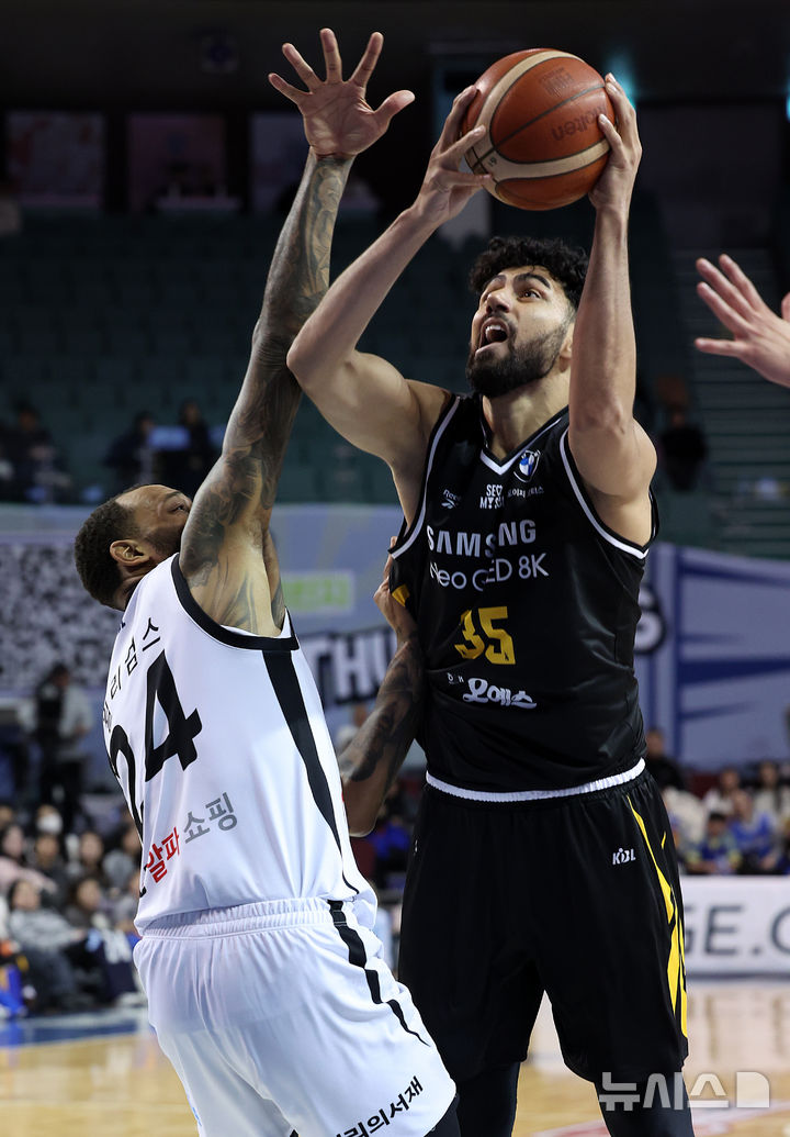 [서울=뉴시스] 이영환 기자 = 5일 오후 서울 송파구 잠실실내체육관에서 열린 2025-2026 KBL 서울 삼성과 수원 KT의 경기, 3쿼터 삼성 케렘 칸터가 KT 데릭 윌리엄스를 앞에 두고 슛을 하고 있다. 2025.12.05. [email protected]