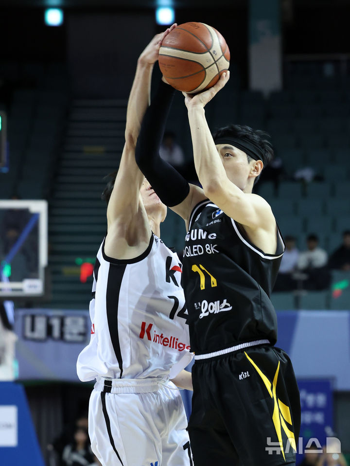 [서울=뉴시스] 이영환 기자 = 5일 오후 서울 송파구 잠실실내체육관에서 열린 2025-2026 KBL 서울 삼성과 수원 KT의 경기, 3쿼터 KT 박민재가 삼성 이관희의 슛을 막아내고 있다 . 2025.12.05. [email protected]