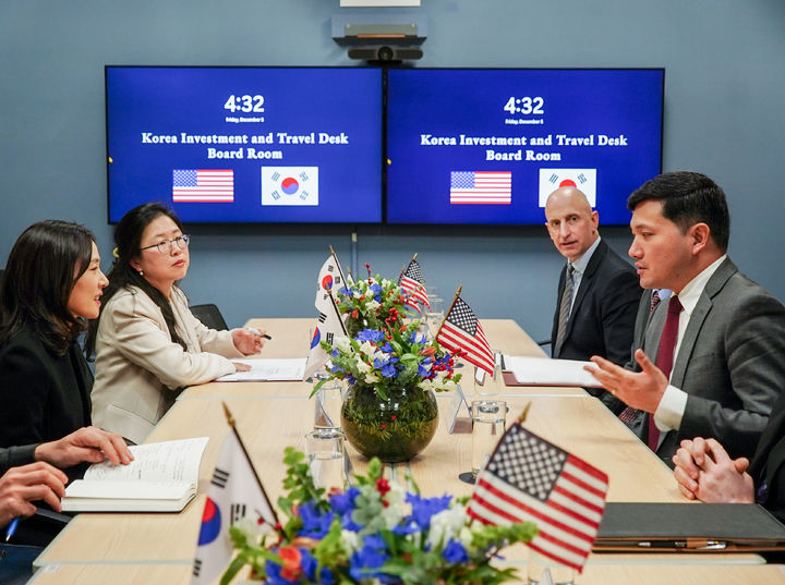 [서울=뉴시스] 김근수 기자 = 김진아 외교부 제2차관이 5일 서울 종로구 주한미국대사관 내에 새롭게 설치된 한국 투자기업 전담창구, 일명 ‘키트 데스크(KIT Desk)’를 방문해 케빈 킴(Kevin Kim) 주한미국대사대리와 함께 한미 상용방문 및 비자 워킹그룹에 대해 논의하고 있다. (사진= 외교부 제공) 2025.12.05. [email protected] *재판매 및 DB 금지