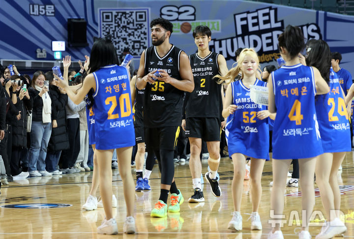 [서울=뉴시스] 이영환 기자 = 5일 오후 서울 송파구 잠실실내체육관에서 열린 2025-2026 KBL 서울 삼성과 수원 KT의 경기에서 96-71로 승리한 삼성 케렘 칸터와 이원석 등이 팬들에게 인사를 하고 있다. 2025.12.05. [email protected]