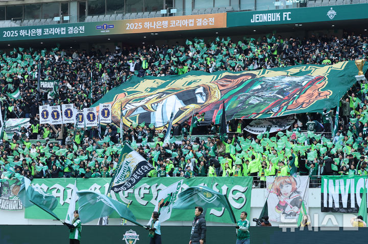 [서울=뉴시스] 권창회 기자 = 6일 오후 서울 마포구 서울월드컵경기장에서 열린 광주FC와 전북현대의 2025 하나은행 코리아컵 결승전에서 전북현대 팬들이 응원을 펼치고 있다. 2025.12.06. [email protected]