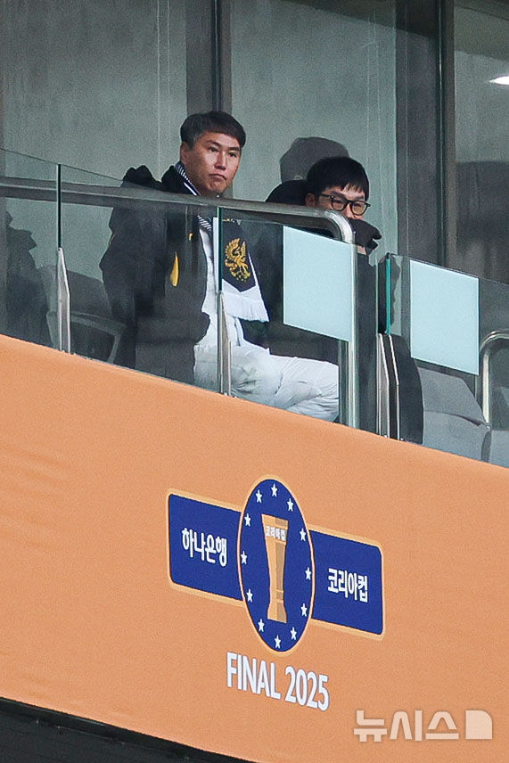 [서울=뉴시스] 권창회 기자 = 이정효 광주FC 감독이 6일 오후 서울 마포구 서울월드컵경기장에서 열린 광주FC와 전북현대의 2025 하나은행 코리아컵 결승전에서 관중석에서 경기를 지켜보고 있다. 2025.12.06. [email protected]