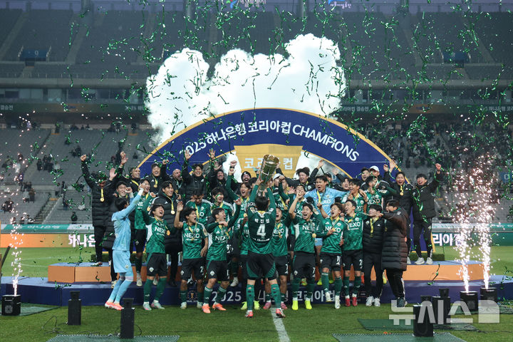 [서울=뉴시스] 권창회 기자 = 6일 오후 서울 마포구 서울월드컵경기장에서 열린 광주FC와 전북현대의 2025 하나은행 코리아컵 결승전에서 2대 1로 승리한 거스 포옛 전북현대 감독을 비롯한 선수들이 우승트로피를 들어올리고 있다. 2025.12.06. [email protected]