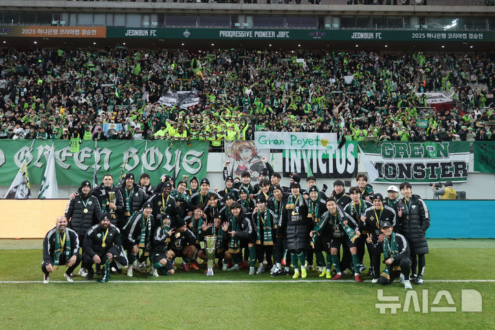 [서울=뉴시스] 권창회 기자 = 6일 오후 서울 마포구 서울월드컵경기장에서 열린 광주FC와 전북현대의 2025 하나은행 코리아컵 결승전에서 2대 1로 승리한 거스 포옛 전북현대 감독을 비롯한 선수들이 기념촬영을 하고 있다. 2025.12.06. [email protected]