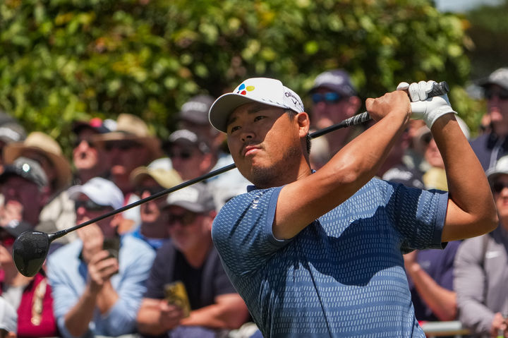 [멜버른=AP/뉴시스] 김시우가 7일(현지 시간) 호주 멜버른의 로열 멜버른 GC에서 열린 DP 월드투어 크라운 호주 오픈 최종 라운드 1번 홀에서 티샷하고 있다. 전날 공동 2위였던 김시우는 최종 라운드에서 역전을 노린다. 2025.12.07.
