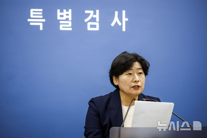 [서울=뉴시스] 정병혁 기자 = 박지영 내란특검 특검보가 7일 서울 서초구 서울고등검찰청에 마련된 내란특검에서 추경호 국민의힘 의원에 대한 내란중요임무종사혐의 기소 브리핑을 하고 있다. 2025.12.07. [email protected]