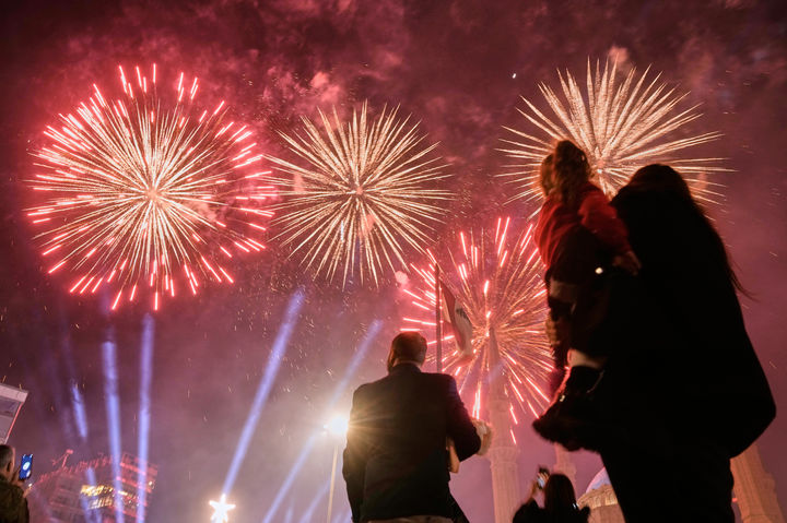 [베이루트=AP/뉴시스] 7일(현지 시간) 레바논 베이루트 도심 순교자 광장 무함마드 알 아민 사원 앞에서 대형 크리스마스트리 점등식이 열려 시민들이 축하 불꽃놀이를 지켜보고 있다. 2025.12.08.