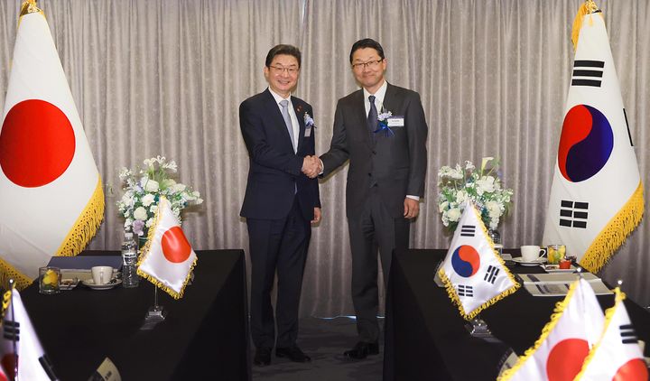 [서울=뉴시스] 이억원(왼쪽) 금융위원장이 8일 부산 해운대구 웨스틴조선 부산에서 열린 제9차 한·일 금융감독 정례회의에 참석해 이토 유타카 일본 금융청장과 기념촬영 하고 있다. (사진=금융위원회 제공) 2025.12.08. [email protected] *재판매 및 DB 금지