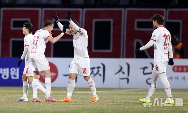 [수원=뉴시스] 이영환 기자 = 8일 오후 수원 장안구 수원종합운동장에서 열린 K리그1 수원FC와 K리그2 부천FC의 승강 플레이오프(PO) 2차전 경기 전반전, 부천 바사니가 선제 골을 넣은 후 갈레고와 기뻐하고 있다. 2025.12.08. [email protected]