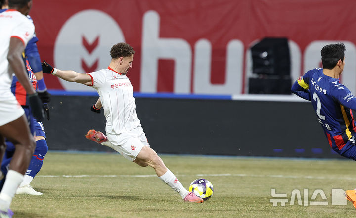 [수원=뉴시스] 이영환 기자 = 8일 오후 수원 장안구 수원종합운동장에서 열린 K리그1 수원FC와 K리그2 부천FC의 승강 플레이오프(PO) 2차전 경기 후반전, 부천 갈레고가 슛을 하고 있다. 2025.12.08. [email protected]