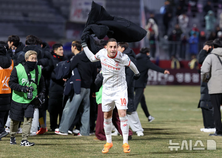 [수원=뉴시스] 이영환 기자 = 8일 오후 수원 장안구 수원종합운동장에서 열린 K리그1 수원FC와 K리그2 부천FC의 승강 플레이오프(PO) 2차전 경기 3-2로 승리해 K리그1 승격에 성공한 부천 바사니가 기뻐하고 있다. 2025.12.08. [email protected]