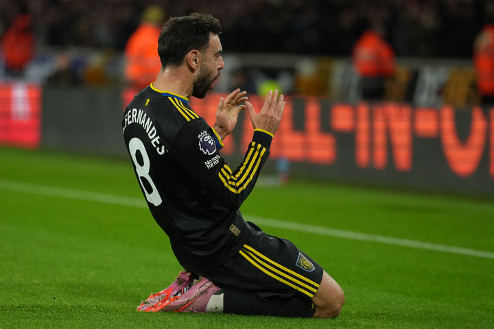 [울버햄프턴=AP/뉴시스] 맨체스터 유나이티드(맨유)의 브루노 페르난데스가 8일(현지 시간) 영국 울버햄프턴 몰리뉴 스타디움에서 열린 2025-26 프리미어리그 15라운드 울버햄프턴 원더러스와 경기 전반 25분 선제골을 넣고 세리머니하고 있다. 페르난데스는 2골 1도움을 기록하며 팀의 4-1 승리를 이끌었다. 황희찬이 결장한 울버햄프턴은 개막 이후 2무 13패로 최하위에 머물고 있다. 2025.12.09.